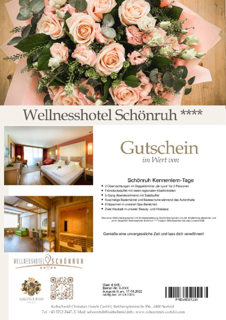 Dieser Gutschein ist für die günstigste Saison des Jahres 2026 ausgestellt und kann gegen Aufpreis vor Ort auch in anderen Zimmerkategorien und anderen Saisonzeiten eingelöst werden!